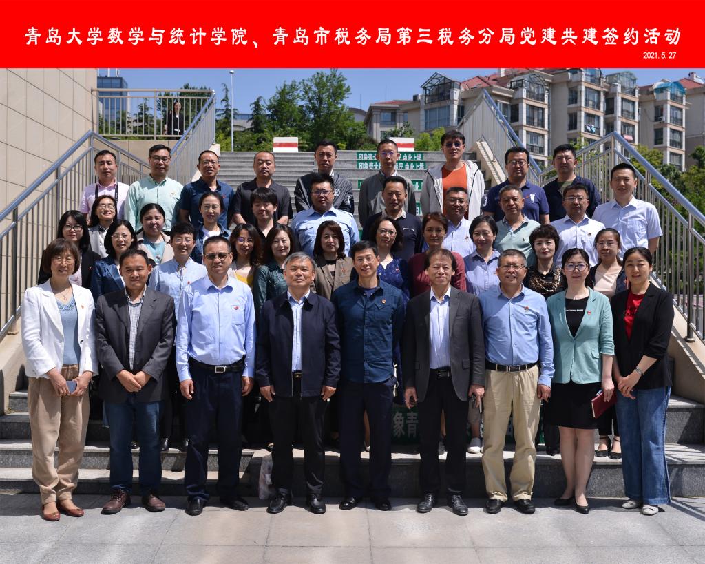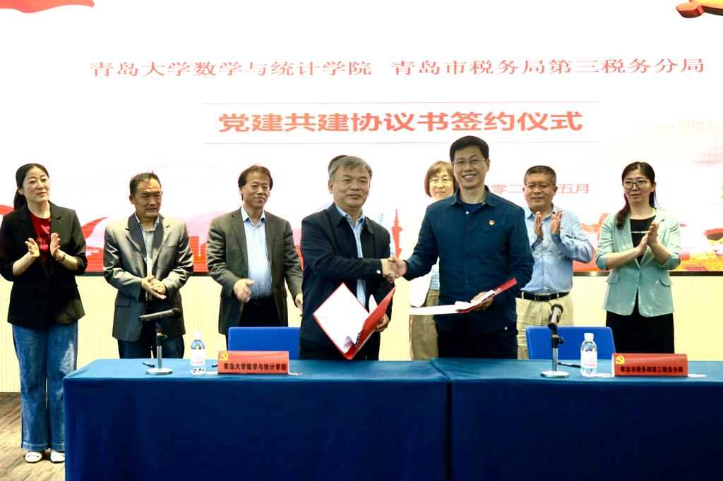 5月27日上午,beat365官方网站与青岛市税务局第三税务分局党建共建签约仪式在会议中心404会议室举行。学院党委书记姜永杰与青岛市税务局第三税务分局副局长、副书记杨建武共同签署党建共建协议书,双方今后将充分发挥各自优长,在党建创新合作方面取得新进展。院长高红伟、副院长李新民,青岛市税务局第三税务分局一级调研员马汝奎、副局孙钟贞、 张武 、刘霞出席本次签约仪式。签约仪式由学院党委副书记张雪蕾主持。