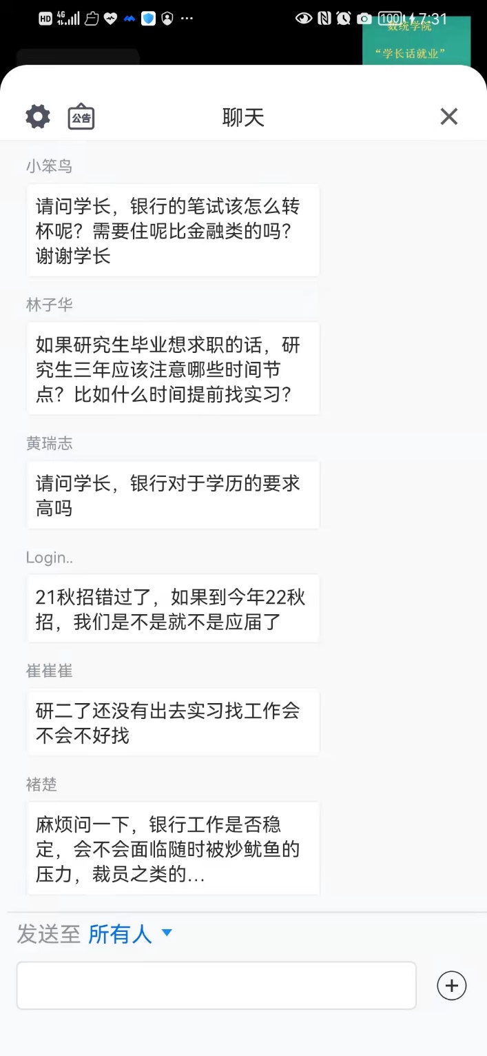 多位同学就自己的就业困惑线上请教,各位校友学长细致耐心的逐一答疑解惑,为同学们理清头绪,拨云见日。多年不见的校友们在消息群里互动致意,同学们则用文字表达了真诚的感谢。张雪蕾对校友们毫无保留的经验分享表示感谢,希望在校同学收获真经,积极行动,苦练内功,早做规划;也祝愿校友们工作顺利,疫情下保护好自己,常回母校看看。