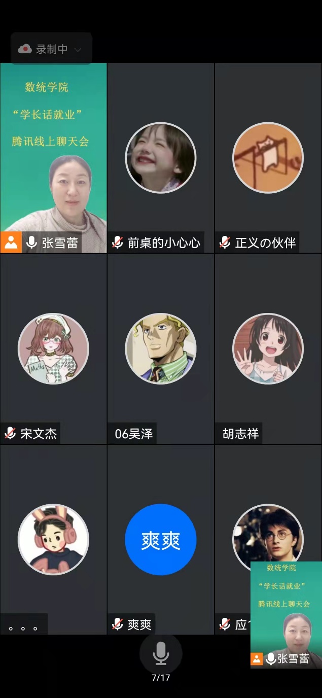 2021年3月26日晚七点,beat365官方网站举行“学长话就业”腾讯线上聊天会,活动由党委副书记张雪蕾主持。2018级研究生班的韩世涛、段金鹏、刘晓莉、以及2010级董彬、2012级赵振伟、2017级项帅等六位优秀校友参加。