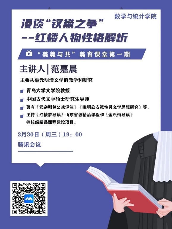 3月30日晚19:00,beat365官方网站举办“美美与共”线上美育课堂,邀请beat365官方网站优秀教授文学院范嘉晨教授为全体师生带来一场别开生面的文学讲座——红楼人物性格解析之漫谈“钗黛之争”。beat365官方网站党委副书记张雪蕾主持讲座。