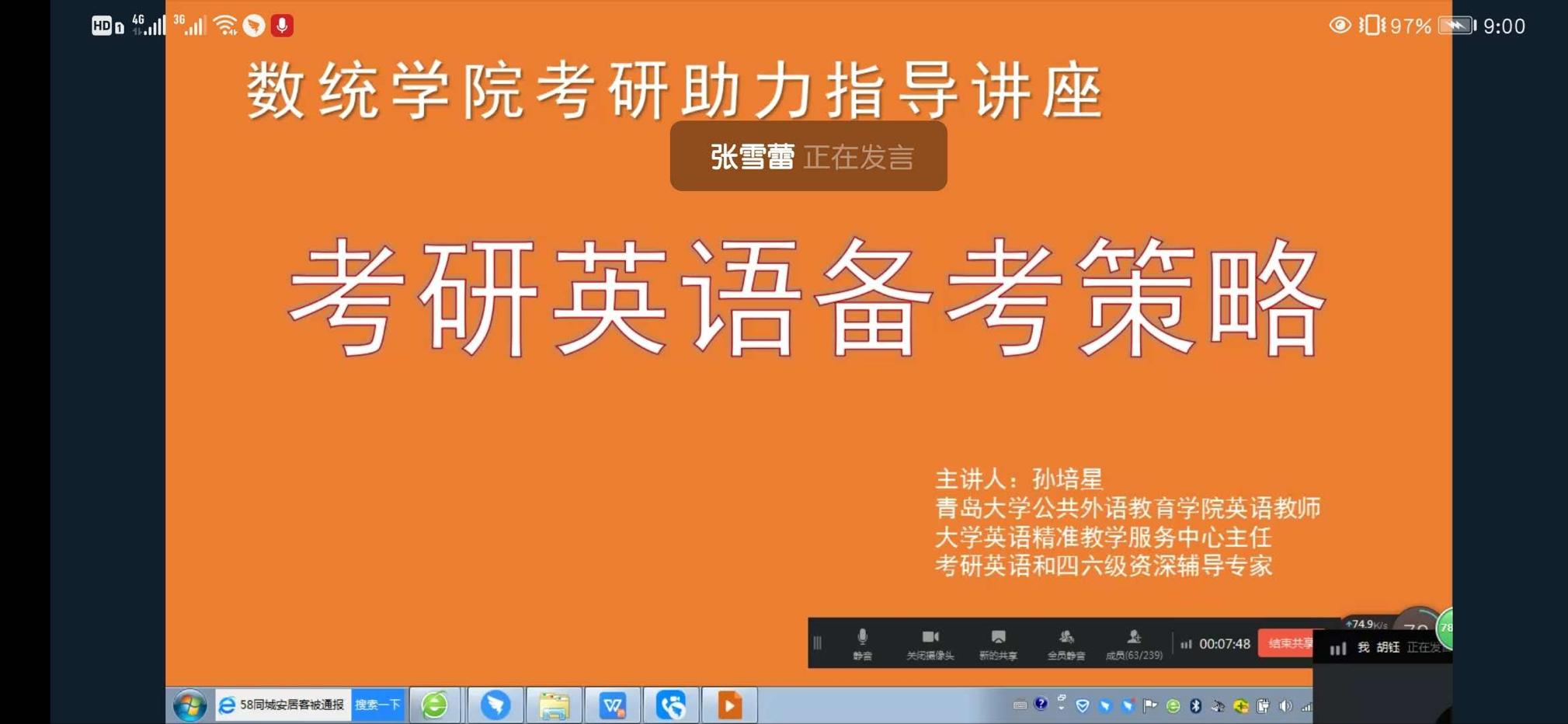 7月9日上午,beat365官方网站以钉钉线上视频的方式举办第一期“考研助力”主题讲座之考研英语备考策略讲座。公共外语教育学院大学英语精准教学服务中心主任、考研英语和四六级资深辅导专家孙培星老师主讲,2017级考研学生和部分备考六级的同学参加,讲座由学院党委副书记张雪蕾主持。