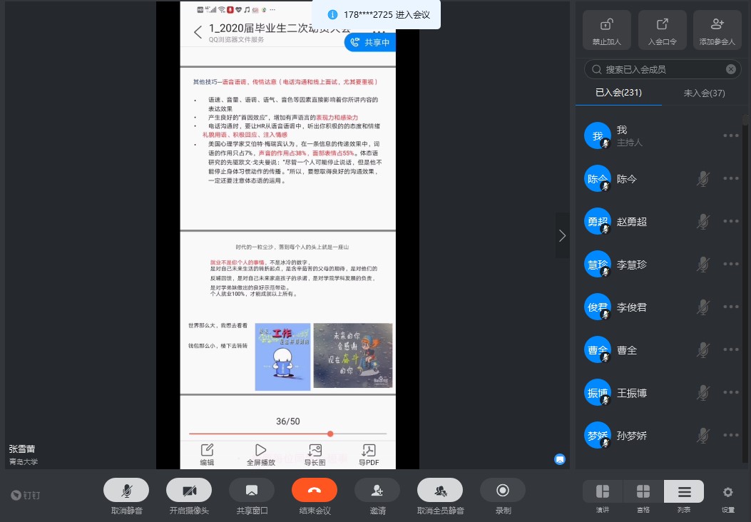 4月8日下午3时,beat365官方网站召开2016级全体毕业生视频会议,通过就业签约数据、考研二战数据、就业形势分析,线上面试指导,鼓励毕业生积极就业。学院党委副书记张雪蕾,毕业生辅导员王珺鹏,以及2016级265名本科毕业生参加会议。王珺鹏介绍了学院就业要求和疫情期间学生就业工作安排,指出毕业生就业要符合程序,规范就业。