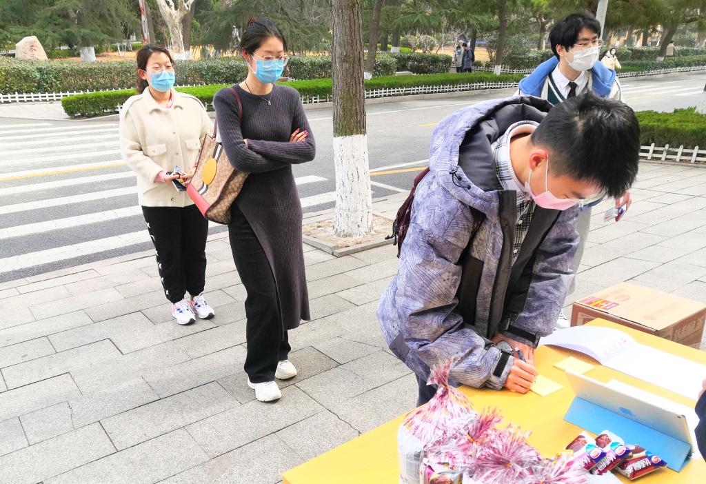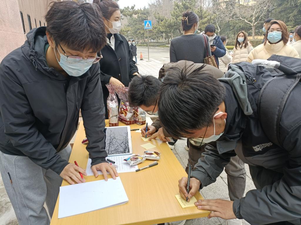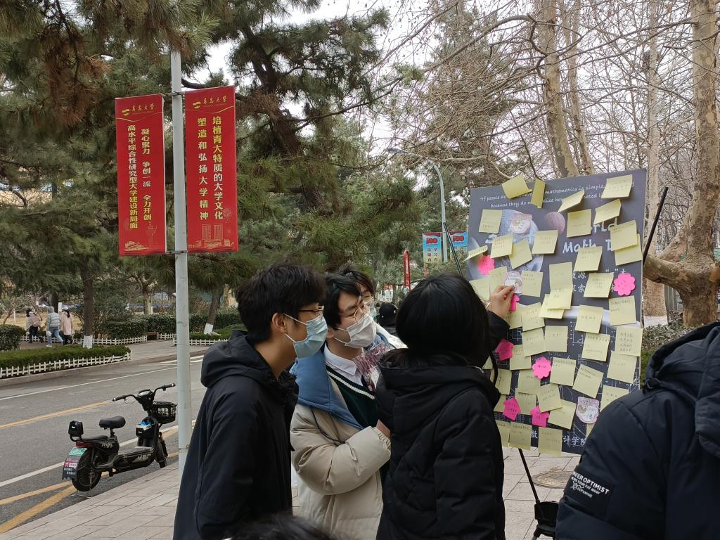 活动以工作人员分享π节由来开始,宣传数学文化,并邀请同学们参与有趣的数学小游戏,受到了同学们的热烈欢迎。在现场组织人员的维控下,同学们保持安全距离,排队有序的参与。活动的最后,同学们纷纷在展板上留下了美好的寄语,比如“数学是世界上最美的学科”、“国际数学日快乐,祝福beat365官方网站越来越好!”、“希望疫情早日结束,青岛加油!”、“早日解封,去看日出日落”等等。