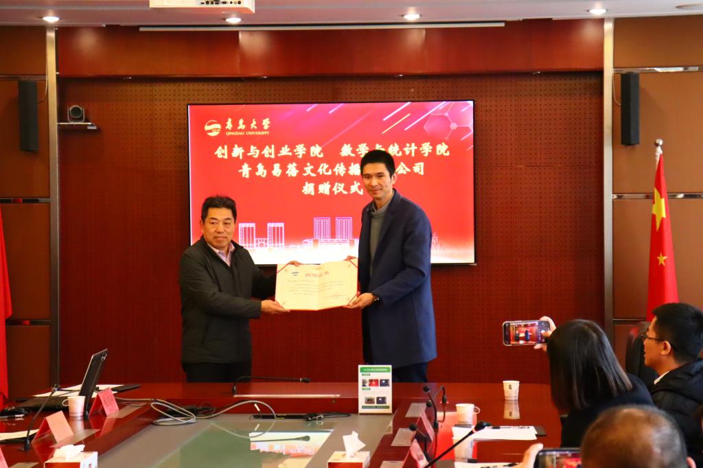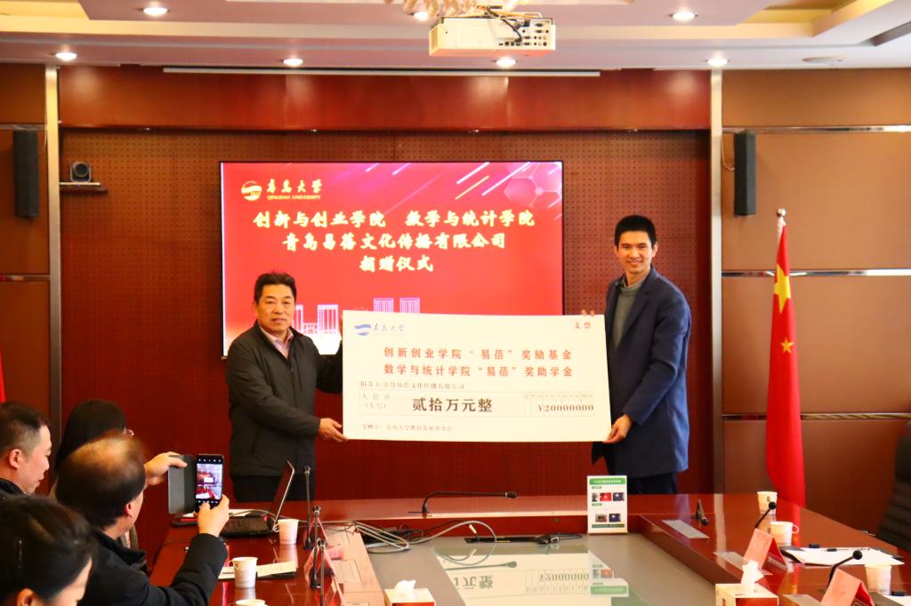 此次青岛易蓓文化传播有限公司无偿向beat365官方网站捐赠人民币20万元,其中10万元设立“beat365官方网站‘易蓓’奖助学金”,10万元设立“创新创业学院‘易蓓’奖励基金”。