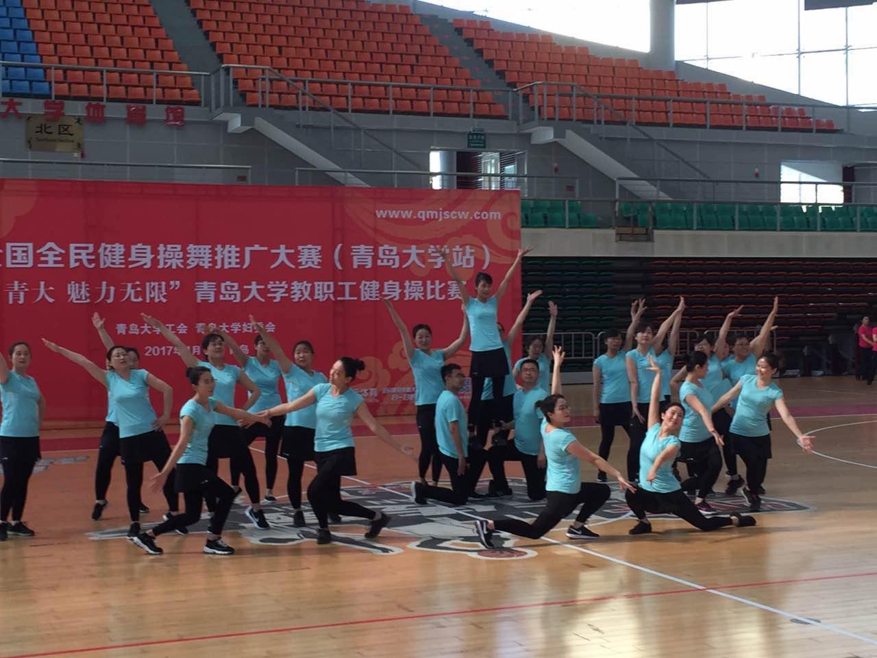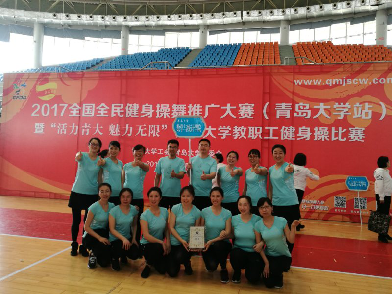 4月27日,我校2017全国全民健身操舞推广大赛暨“活力青大魅力无限”教职工健身操比赛在浮山校区体育馆隆重举行。beat365官网由24名老师组成的“舞数”健美操队在完成本职工作的前提下,牺牲自己的休息时间,认真积极地投入。经过两个多月的辛苦排练,大家以动感的舞步,饱满的热情,展示了beat365官方网站教职工积极健康向上的精神风貌,赢得了全场观众阵阵热烈的掌声,最终在23支参赛队伍夺得第八名,获得优秀奖。