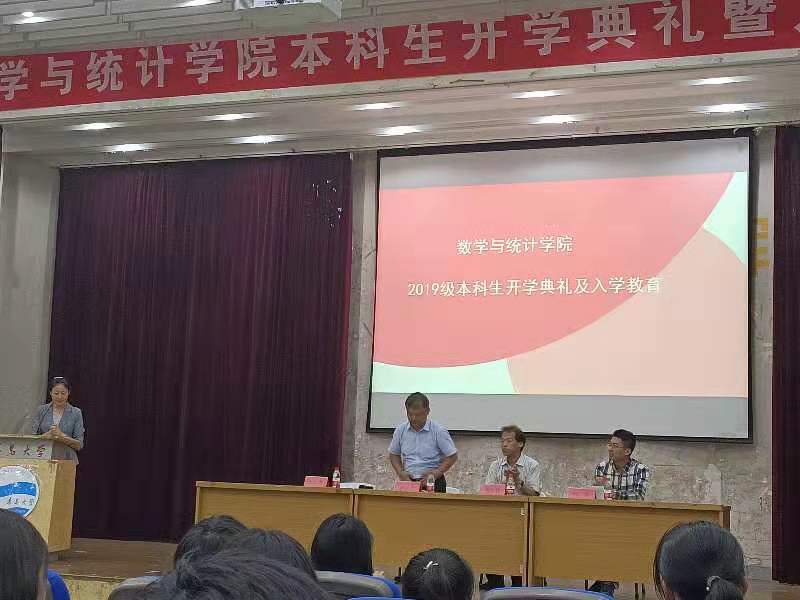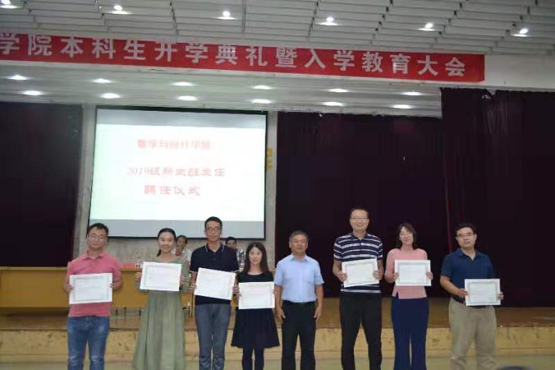 大会第一项,全体新生迎面国旗,齐声合唱《歌唱祖国》。大家情感真挚,用热情洋溢的歌声表达了对祖国70华诞的衷心祝福。党委书记姜永杰、院长高红伟先后进行致辞。党委书记姜永杰送给19级新生“追梦、勤奋、励志、诚信”八个字,希望同学们始终牢记以上八字,并将其内化为自身的良好品质。院长高红伟在表达对19级新生的美好祝愿与殷切期望的同时,也强调了数学学科的重要性及未来发展前景。他介绍了学院的历史发展及师资情况,结合自身求学经历,引领大家走进数学之美。随后16级汤雨晴同学及19级新生张祥同学分别发言。大会播放了不同行业优秀校友录制的祝福视频,并用图片又介绍了三位行业佼佼者校友。典礼中还举行了2019级班主任聘任仪式,姜永杰书记为七位班主任颁发了聘书。
