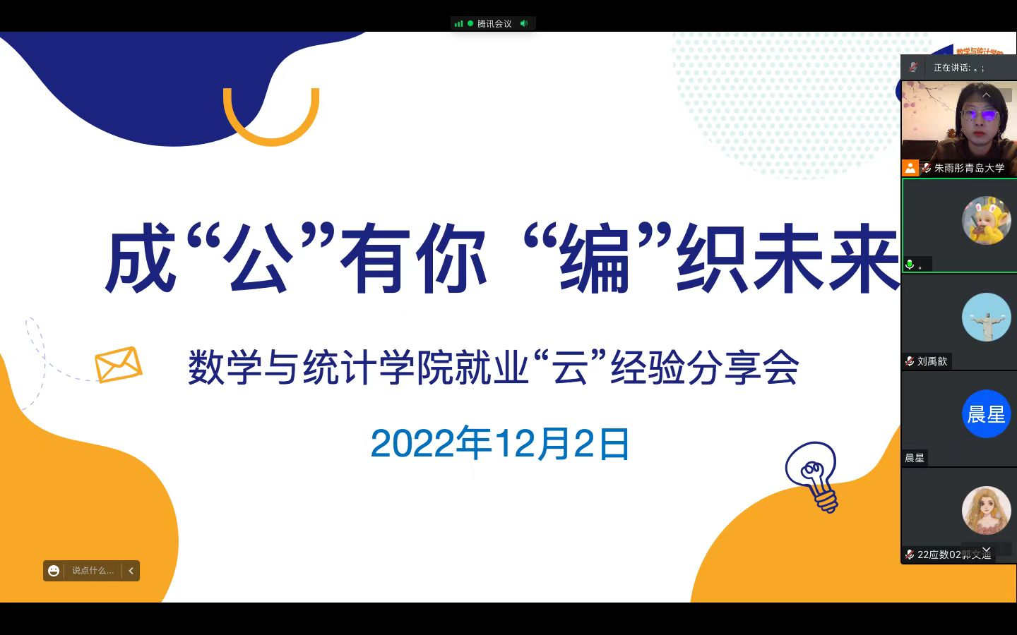 为进一步提升我院应届毕业生求职就业能力,帮助有意向考公、考编的学生更高效备考,12月2日19:00,beat365官网线上举办主题为“成‘公’有你,‘编’织未来”的就业“云”经验分享交流会,邀请到黄旸、崔丹丹、刘星、王春荣、田昌源五位优秀毕业生进行就业经验分享。院党委副书记魏小平、团委书记朱雨彤参与会议,本次会议由朱雨彤主持,本院学生积极参会听会。