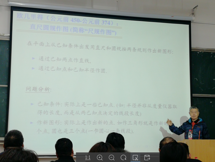 3月31日上午,在金家岭校区西一教111,华中师范大学樊恽教授应邀来beat365官方网站做了题为“几何作图——从欧几里得到高斯、伽罗瓦”的学术报告。报告由beat365官方网站院长高红伟主持,学院党委副书记张雪蕾、海进科教授、辅导员王珺鹏及2018级本科生近200人聆听报告会。此次报告为数统学院“师说新语”讲座2019年第二期,总第8期。