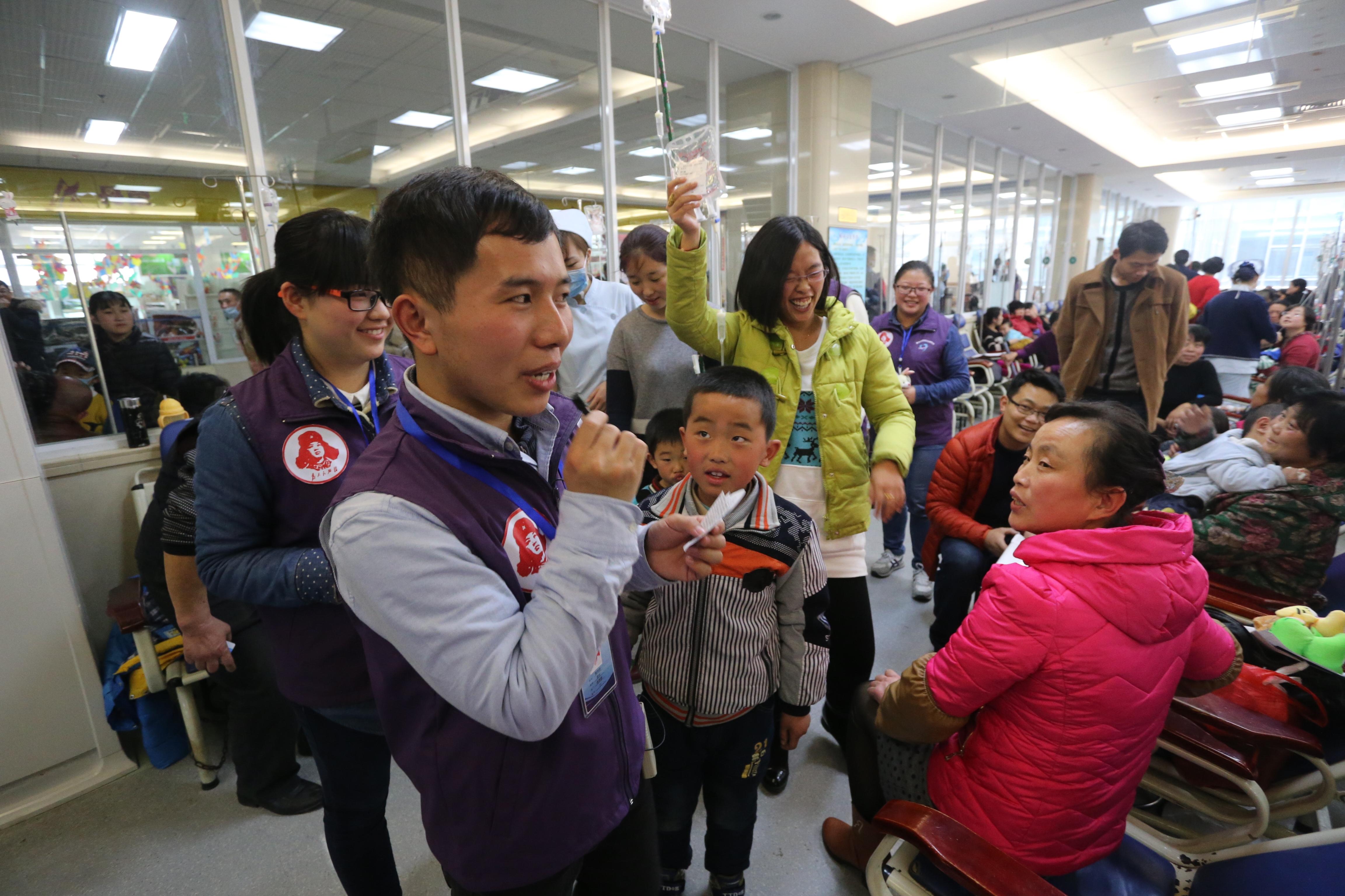 志愿者们从8点开始帮助前来就医的市民挂号、导诊等工作。为缓解前来输液的儿童及家长的无聊时间,志愿者在儿童输液处开展了“送温暖”活动:给小朋友们讲雷锋故事、发起由小朋友和家长共同参与的答题环节。小朋友及家长们参与热情高涨,氛围十分融洽。在活动最后,志愿者以三个有趣魔术表演结束了此次“送温暖”活动。志愿者们用自己的行动给正在医院就诊的患者带来了欢乐。
