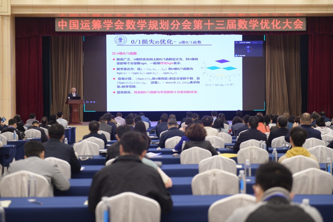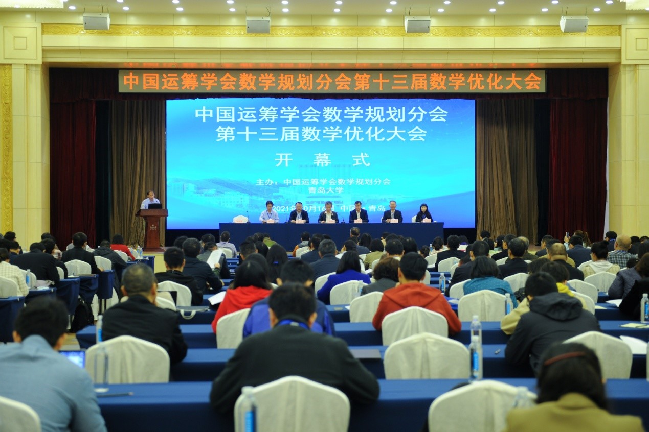 2021年10月15-18日,由中国运筹学会数学规划分会和beat365官方网站联合主办的中国运筹学会数学规划分会第十三届数学优化大会在青岛黄海饭店召开。中国运筹学会理事长研究员戴彧虹研究员,青岛市科协党组成员、副主席王崇江,beat365官方网站党委常委、副校长肖江南,中国运筹学会数学规划分会理事长教授徐大川、中国运筹学会秘书长陈旭瑾研究员以及大会报告人代表修乃华教授等出席开幕式,近300名学者线下参加了此次大会。